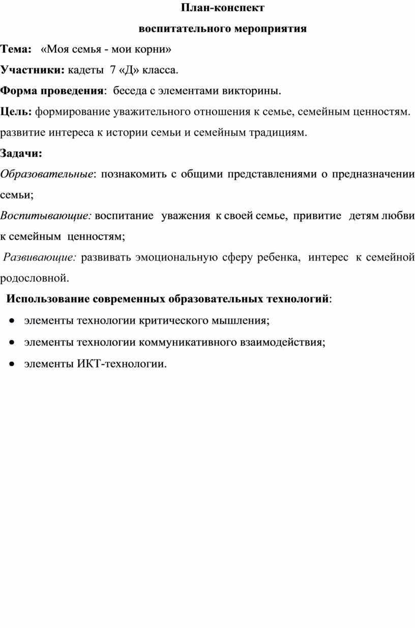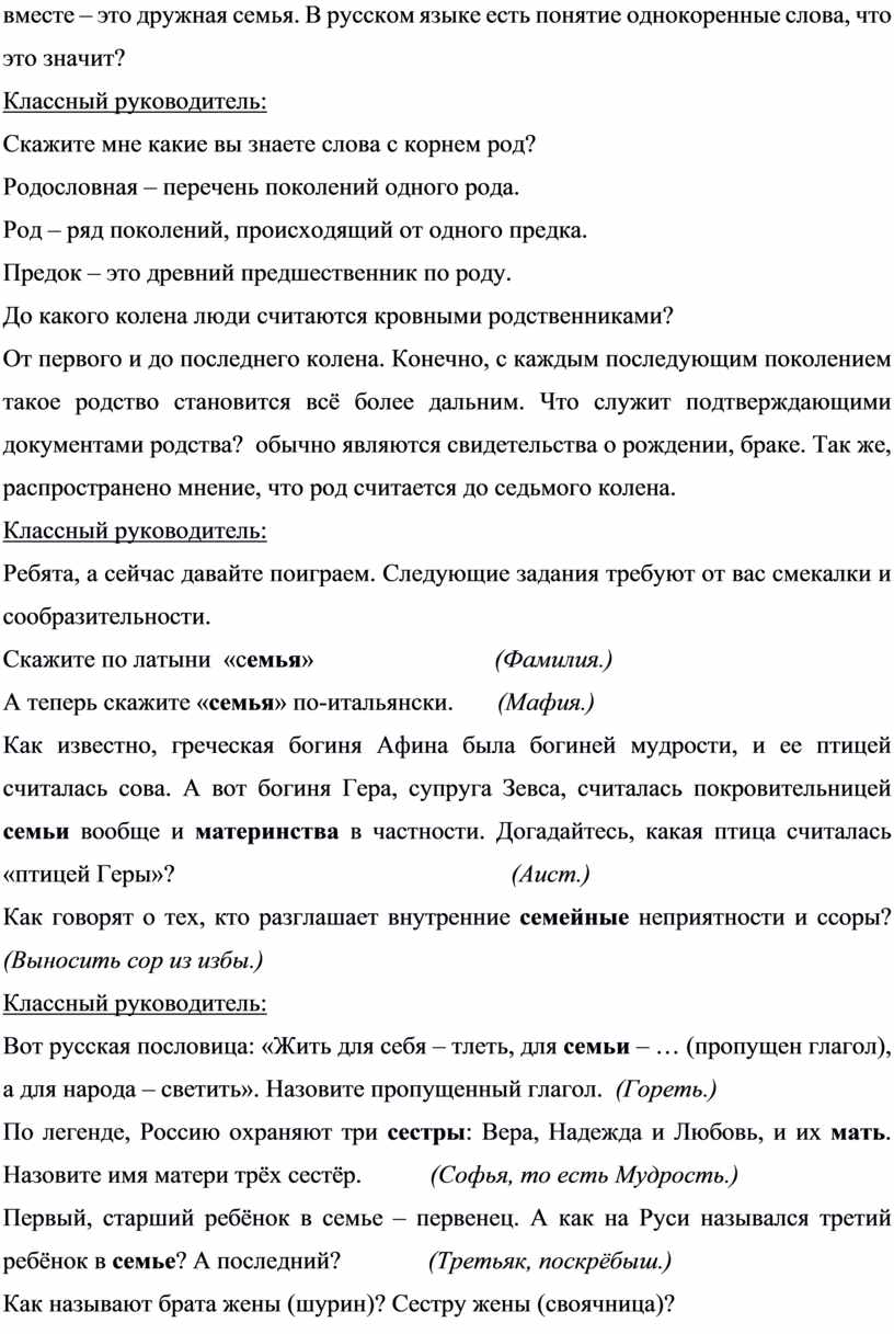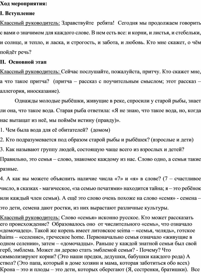 Классный руководитель: Здравствуйте ребята! Сегодня мы продолжаем говорить с вами о значимом для каждого слове. В нем есть все: и корни, и листья, и стебельки, и солнце, и тепло, и ласка, и строгость, и забота, и любовь. Кто мне скажет, о чём пойдёт речь?
