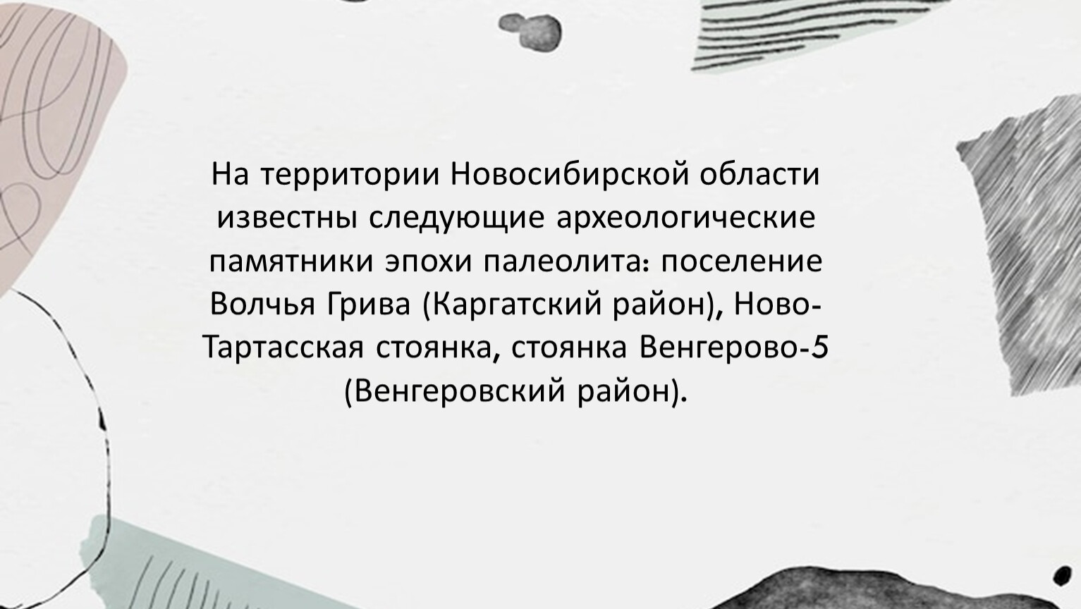 На территории Новосибирской области известны следующие археологические памятники эпохи палеолита: поселение Волчья Грива (Каргатский район), Ново-Тартасская стоянка, стоянка Венгерово-5 (Венгеровский район).