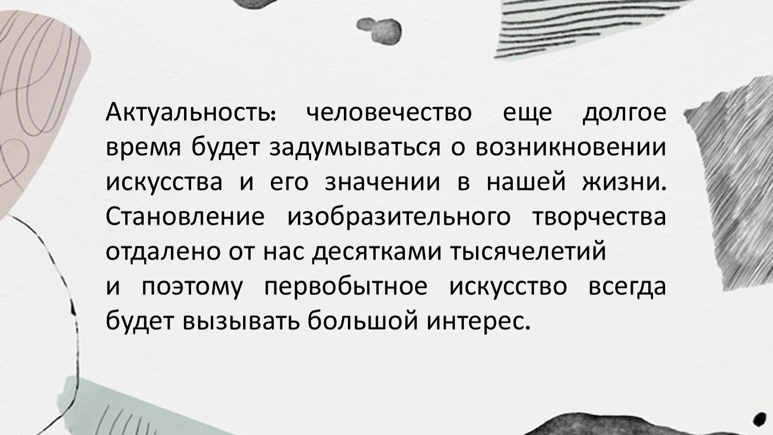 Актуальность: человечество еще долгое время будет задумываться о возникновении искусства и его значении в нашей жизни. Становление изобразительного творчества отдалено от нас десятками тысячелетий