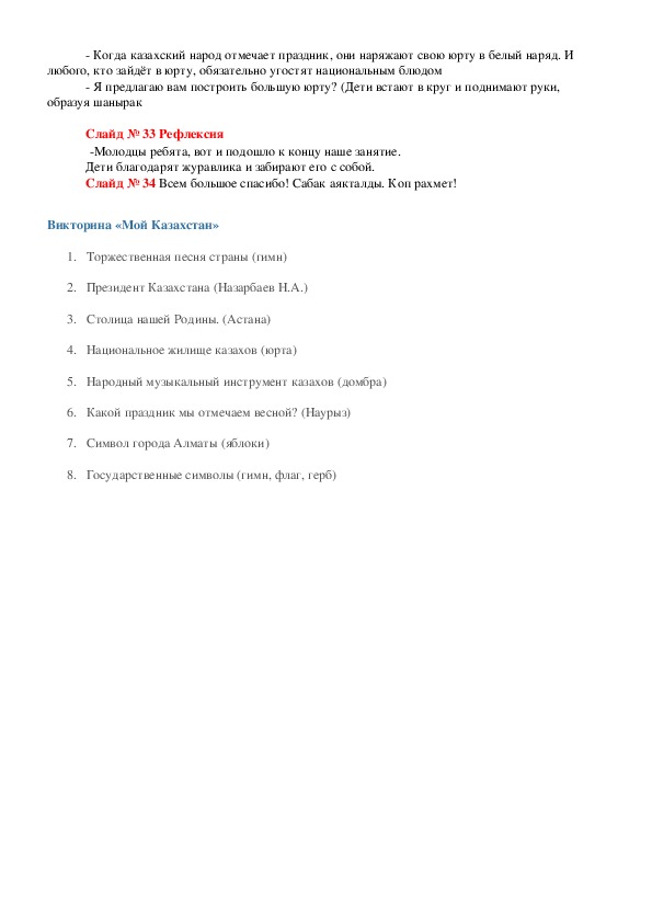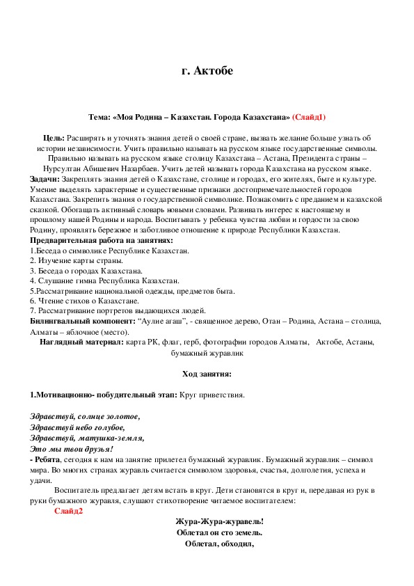 Задачи: Закреплять знания детей о Казахстане, столице и городах, его жителях, быте и культуре.