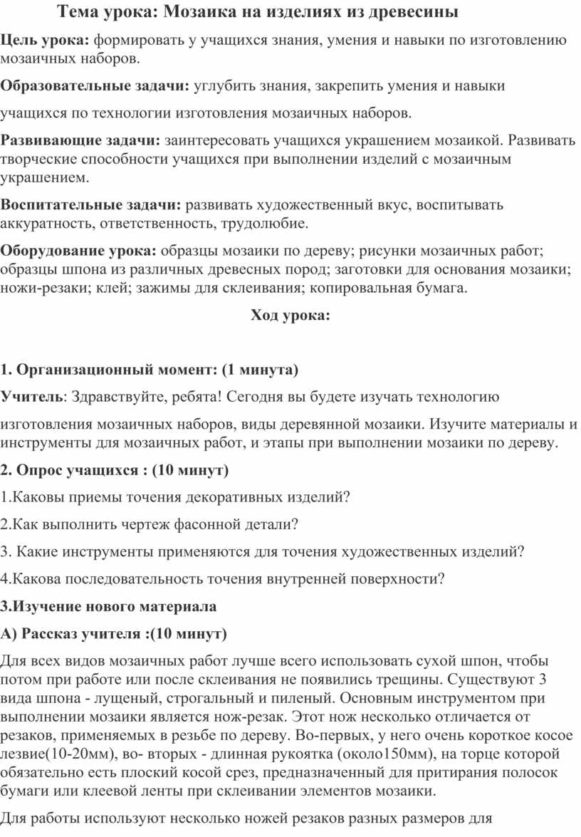 Оборудование урока: образцы мозаики по дереву; рисунки мозаичных работ; образцы шпона из различных древесных пород; заготовки для основания мозаики; ножи-резаки; клей; зажимы для склеивания; копировальная бумага.