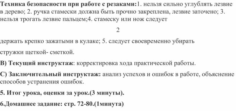 Техника безопасности при работе с резаками:1. нельзя сильно углублять лезвие в дерево; 2. ручка стамески должна быть прочно закреплена, лезвие заточено; 3. нельзя трогать лезвие пальцем;4. стамеску или нож следует