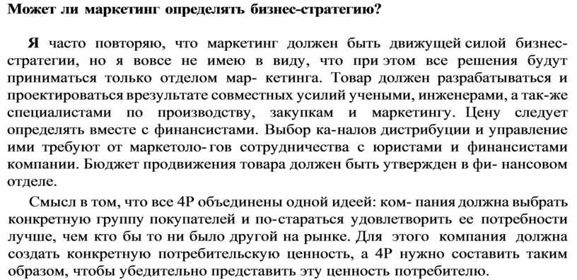 Смысл в том, что все 4Р объединены одной идеей: ком пания должна выбрать конкретную группу покупателей и по стараться удовлетворить ее потребности лучше, чем кто бы то ни было другой на рынке. Для этого компания должна создать конкретную потребительскую ценность, а 4Р нужно составить таким образом, чтобы убедительно представить эту ценность потребителю.