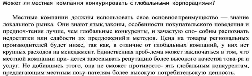 Местные компании должны использовать свое основное преимущество — знание локального рынка. Они знают язык, законы, особенности покупательского поведения и предпоч тения лучше, чем глобальные конкуренты, и зачастую спо собны распознать недостатки или слабости их предложений и методов. Цена на товары региональных производителей будет ниже, так как, в отличие от глобальных компаний, у них нет крупных расходов на менеджмент. Единственная проб лема может заключаться в том, что местной компании при дется завоевывать репутацию более высокого качества това ра и услуг. Не добившись этого, она не сможет противосто ять глобальным конкурентам, предлагающим местным поку пателям более высокую потребительскую ценность.