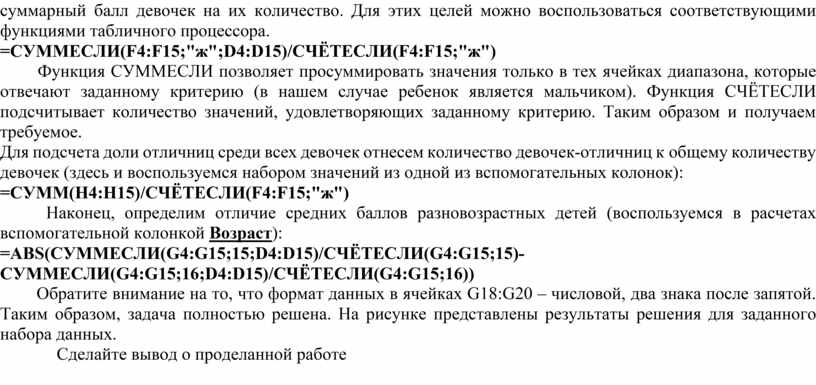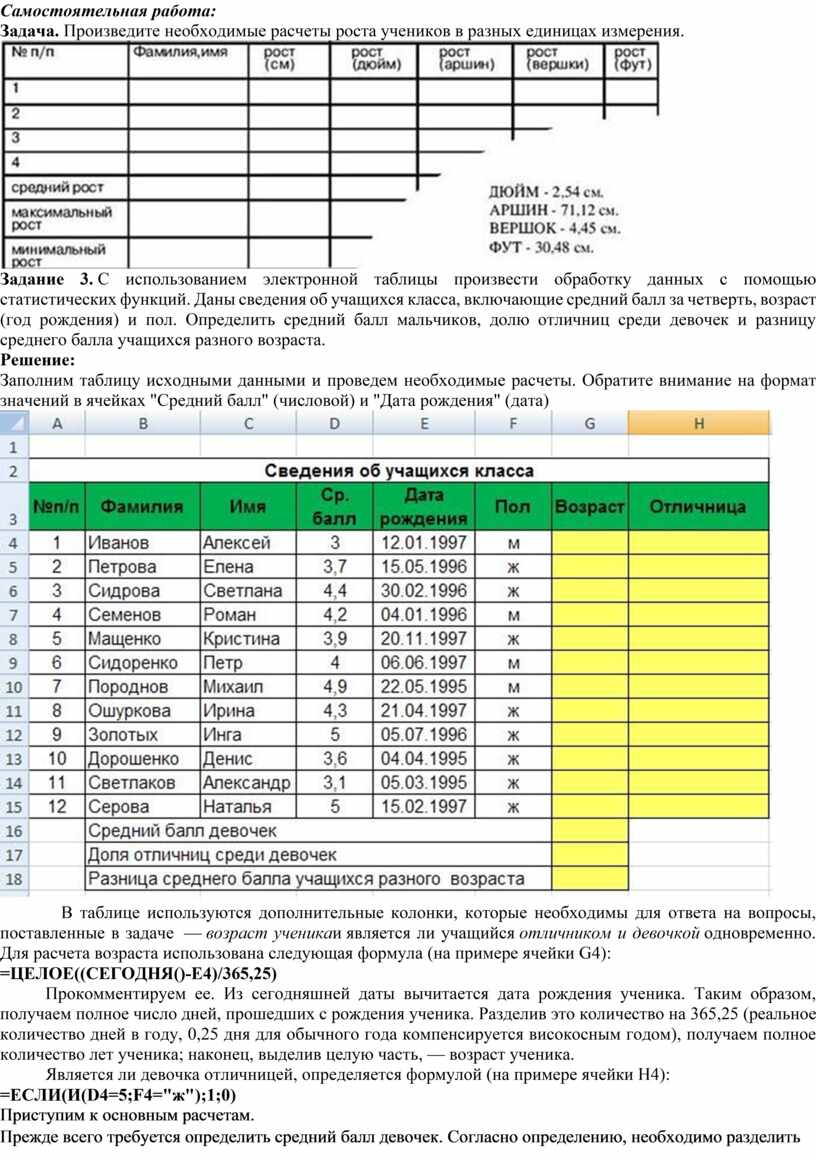 Задание 3. С использованием электронной таблицы произвести обработку данных с помощью статистических функций. Даны сведения об учащихся класса, включающие средний балл за четверть, возраст (год рождения) и пол. Определить средний балл мальчиков, долю отличниц среди девочек и разницу среднего балла учащихся разного возраста.