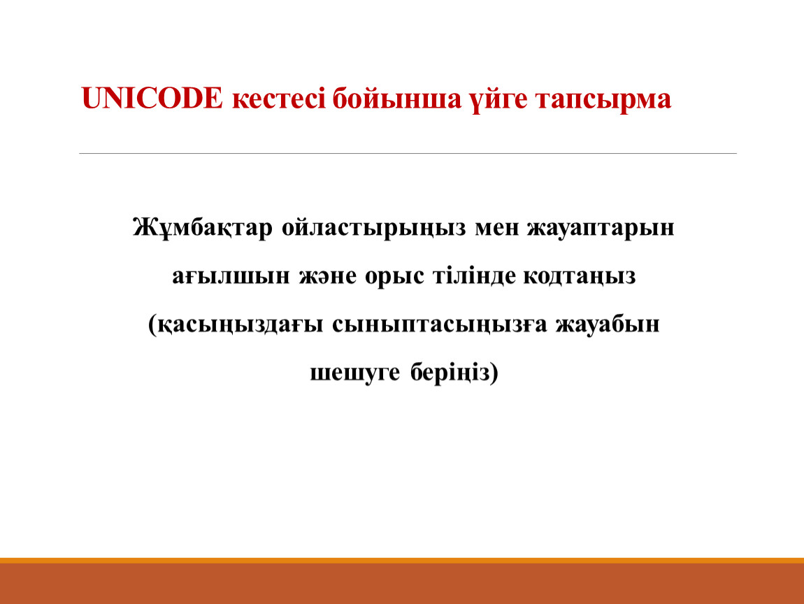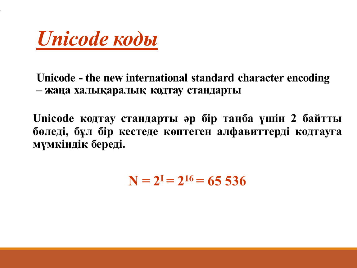 Unicode кодыUnicode - the new international standard character encoding – жаңа халықаралық кодтау стандарты