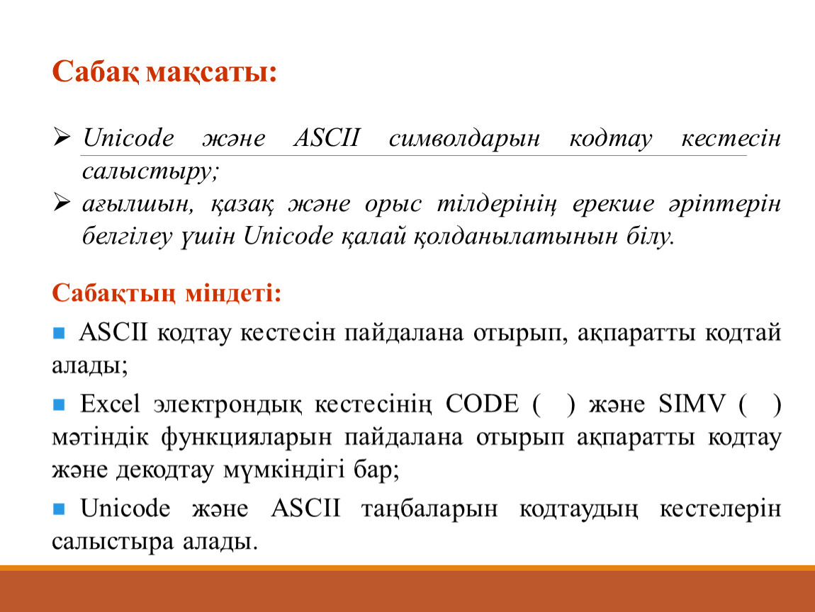 Excel электрондық кестесінің CODE ( ) және SIMV ( ) мәтіндік функцияларын пайдалана отырып ақпаратты кодтау және декодтау мүмкіндігі бар;