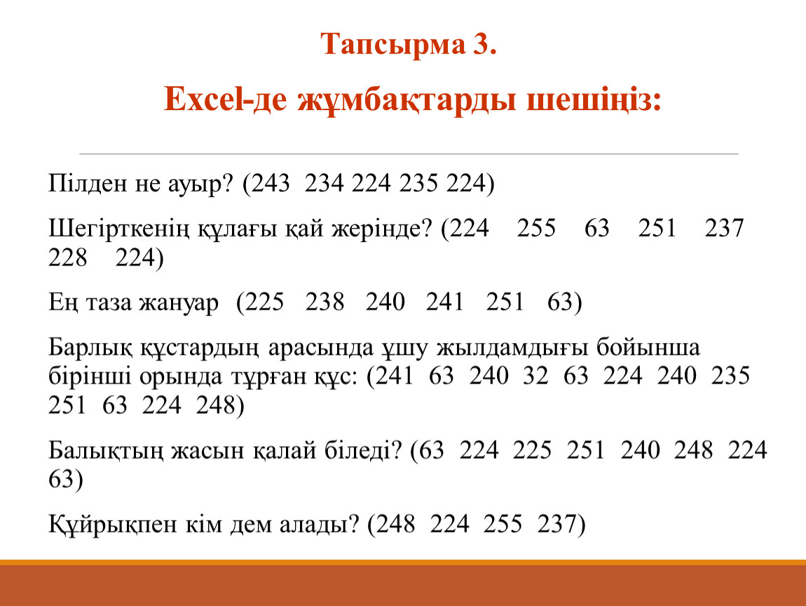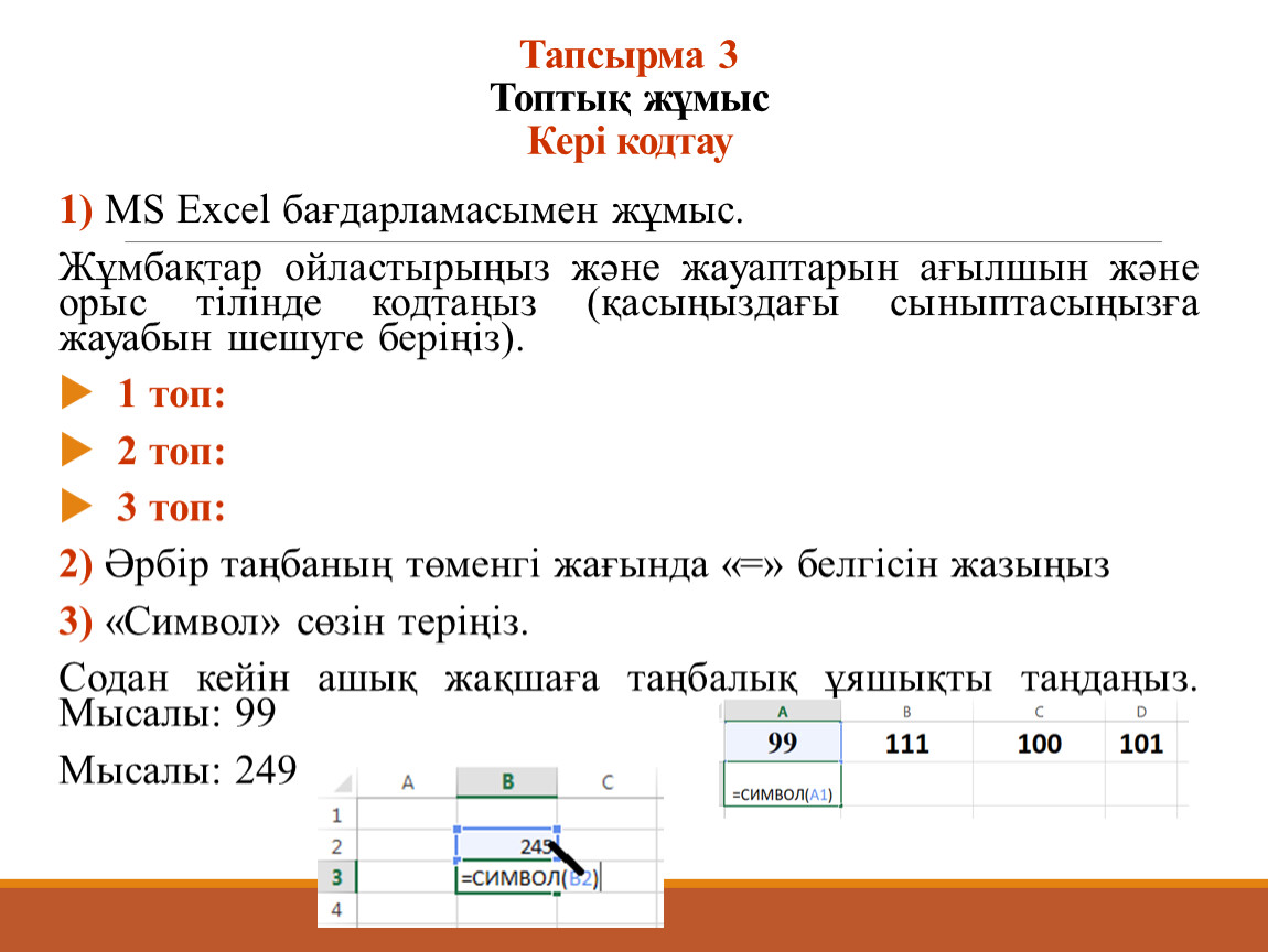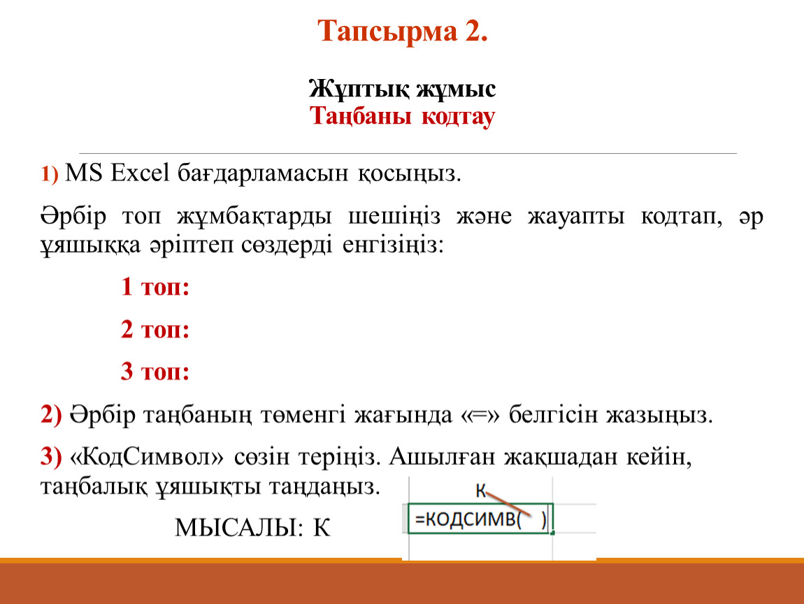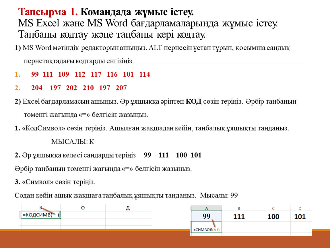 Тапсырма 1. Командада жұмыс істеу. MS Excel және MS Word бағдарламаларында жұмыс істеу. Таңбаны кодтау және таңбаны кері кодтау.