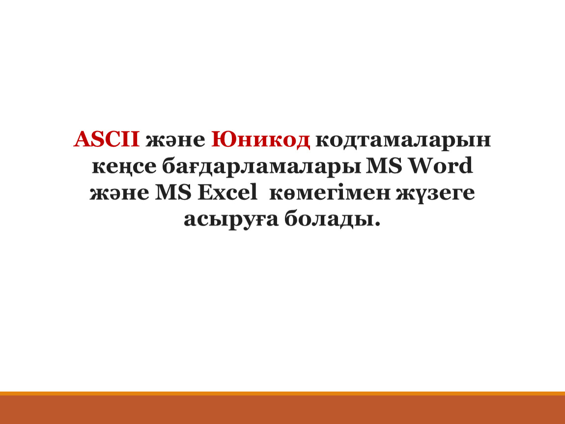 ASCII және Юникод кодтамаларын кеңсе бағдарламалары MS Word және MS Excel көмегімен жүзеге асыруға болады.