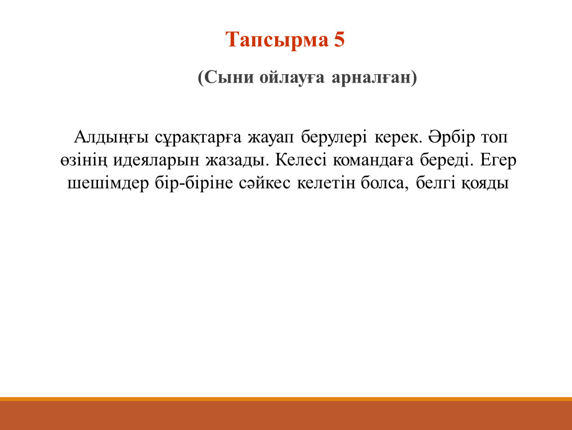 Алдыңғы сұрақтарға жауап берулері керек. Әрбір топ өзінің идеяларын жазады. Келесі командаға береді. Егер шешімдер бір-біріне сәйкес келетін болса, белгі қояды