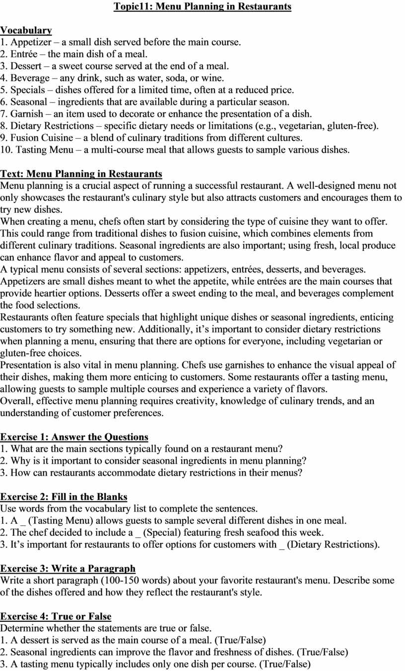 1. Виктор работает официантом. 2. Он работает в ресторане. 3. Он приходит на работу в 10 часов утра. 4. Официанты, официантки и метрдотели готовят зал к обеду. 5. Гости приходят в 11 часов. 6. Официанты рекомендуют порционные блюда и дежурные блюда на обед. 7. Официанты рекомендуют фирменные блюда для обеда. 8. Гости хорошо проводят время вечером. 9. Виктор любит свою работу. 10. Обед подаётся до 7 часов вечера. 11. Официанты обслуживают гостей до полуночи.
