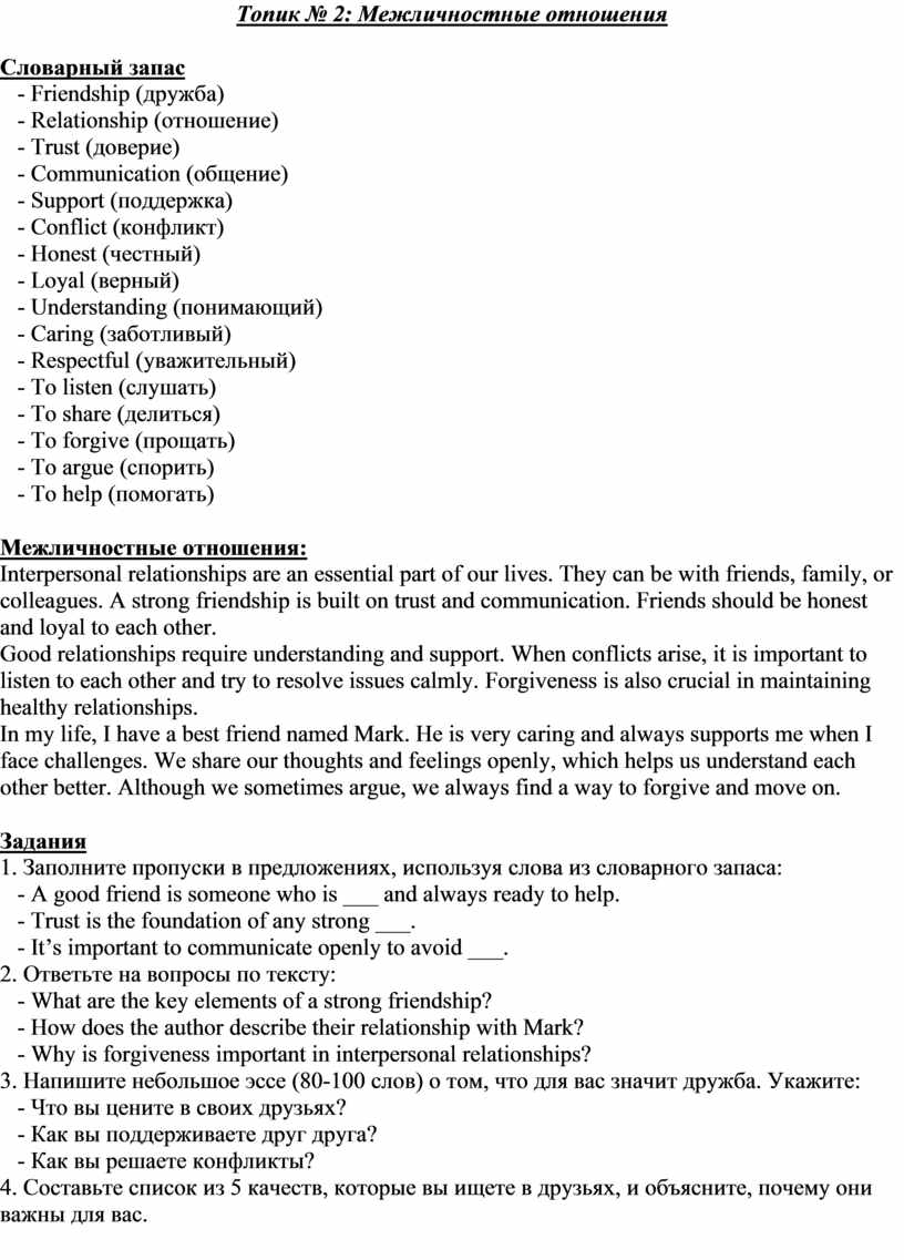3. Напишите небольшое эссе (80-100 слов) о том, что для вас значит дружба. Укажите: