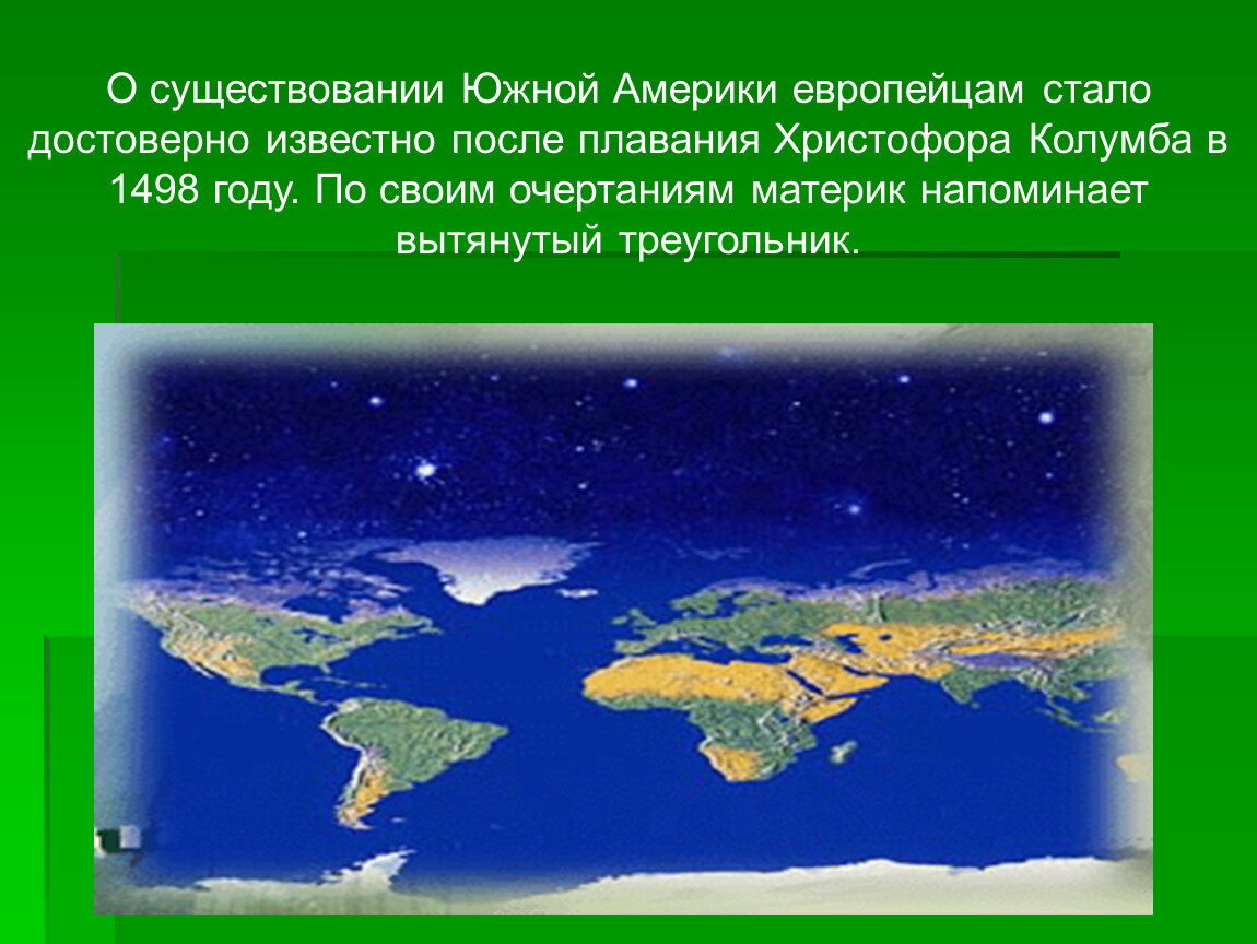 О существовании Южной Америки европейцам стало достоверно известно после плавания Христофора Колумба в 1498 году. По своим очертаниям материк напоминает вытянутый треугольник.