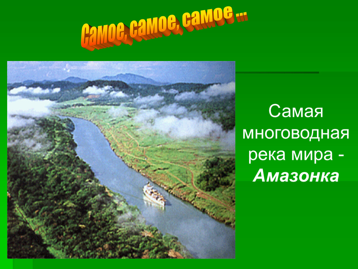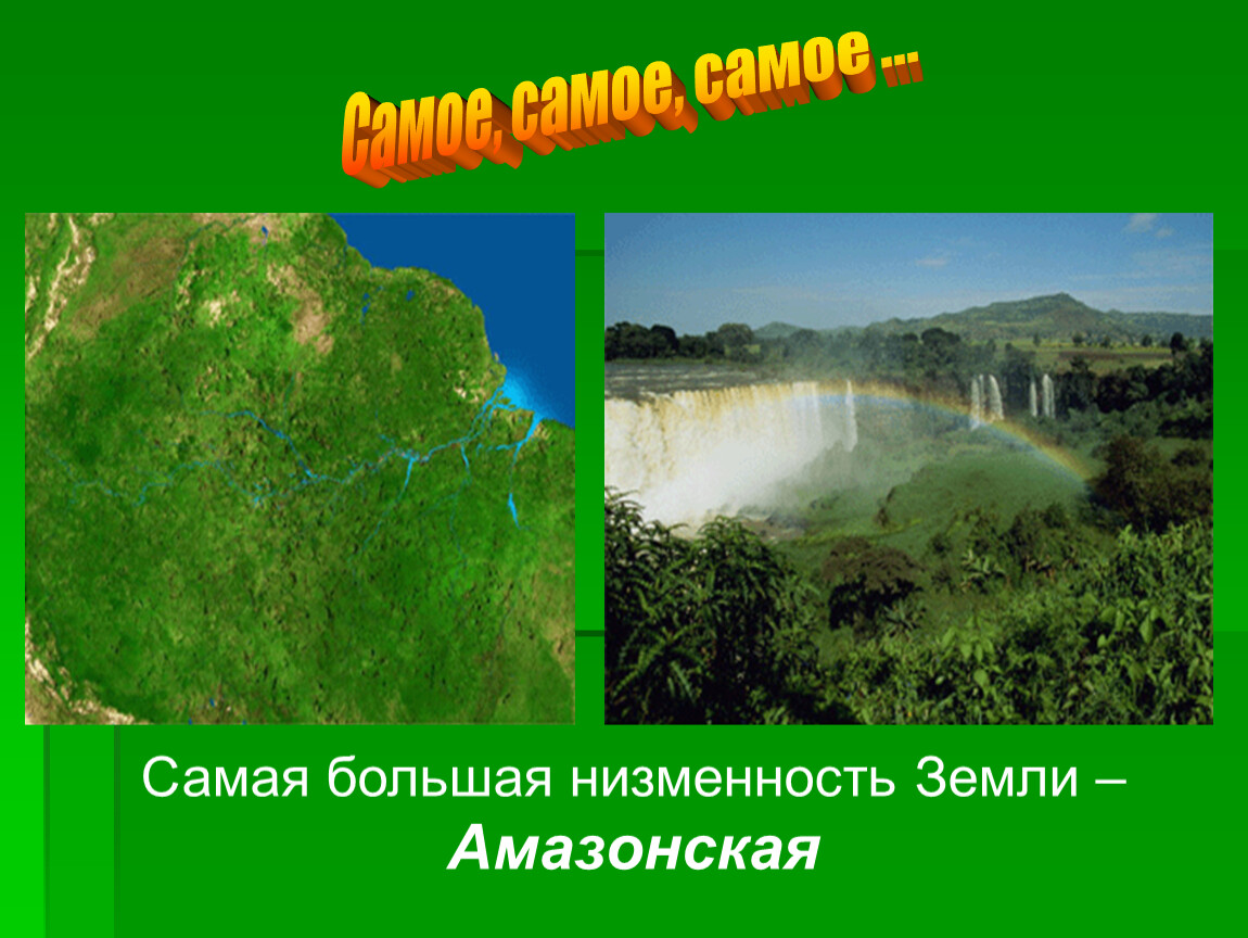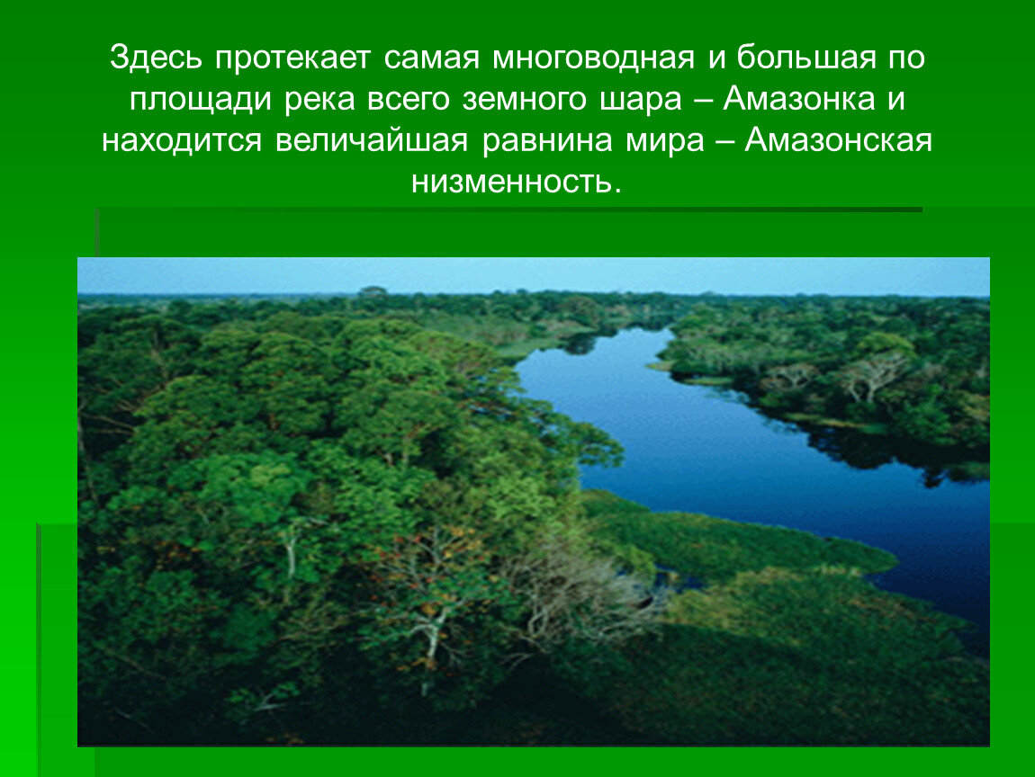 Здесь протекает самая многоводная и большая по площади река всего земного шара – Амазонка и находится величайшая равнина мира – Амазонская низменность.