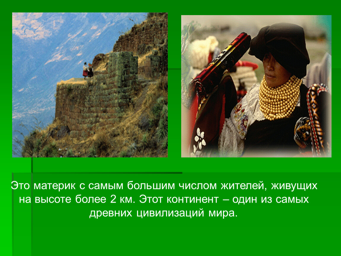 Это материк с самым большим числом жителей, живущих на высоте более 2 км. Этот континент – один из самых древних цивилизаций мира.