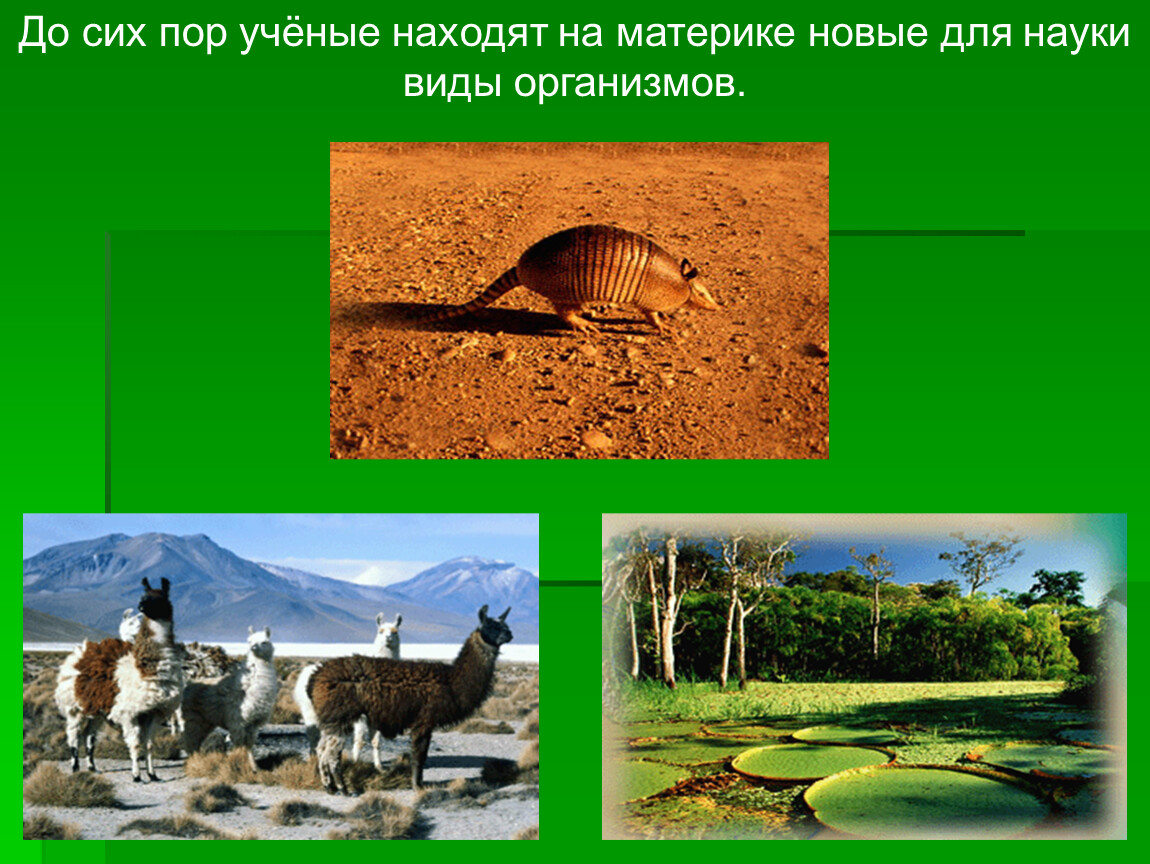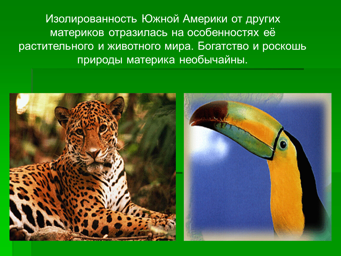 Изолированность Южной Америки от других материков отразилась на особенностях её растительного и животного мира. Богатство и роскошь природы материка необычайны.