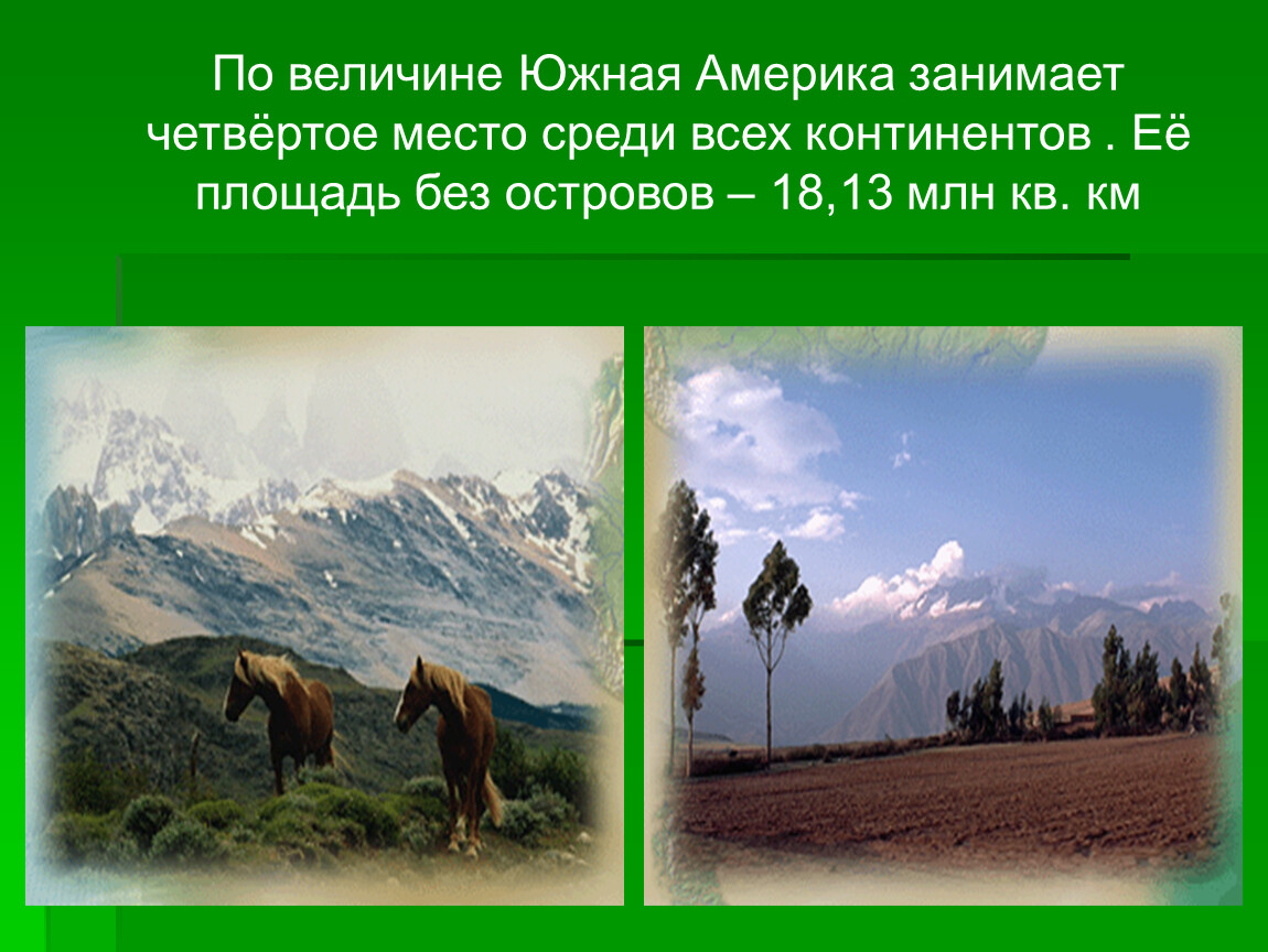 По величине Южная Америка занимает четвёртое место среди всех континентов . Её площадь без островов – 18,13 млн кв. км