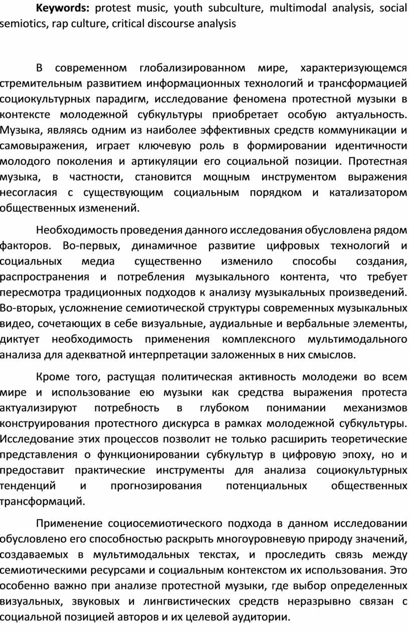 Ключевые слова: протестная музыка, молодежная субкультура, мультимодальный анализ, социальная семиотика, рэп-культура, критический дискурс-анализ