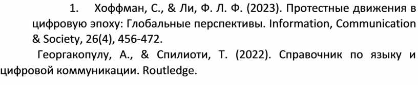 11. Хоффман, С., & Ли, Ф. Л. Ф. (2023). Протестные движения в цифровую эпоху: Глобальные перспективы. Information, Communication & Society, 26(4), 456-472.