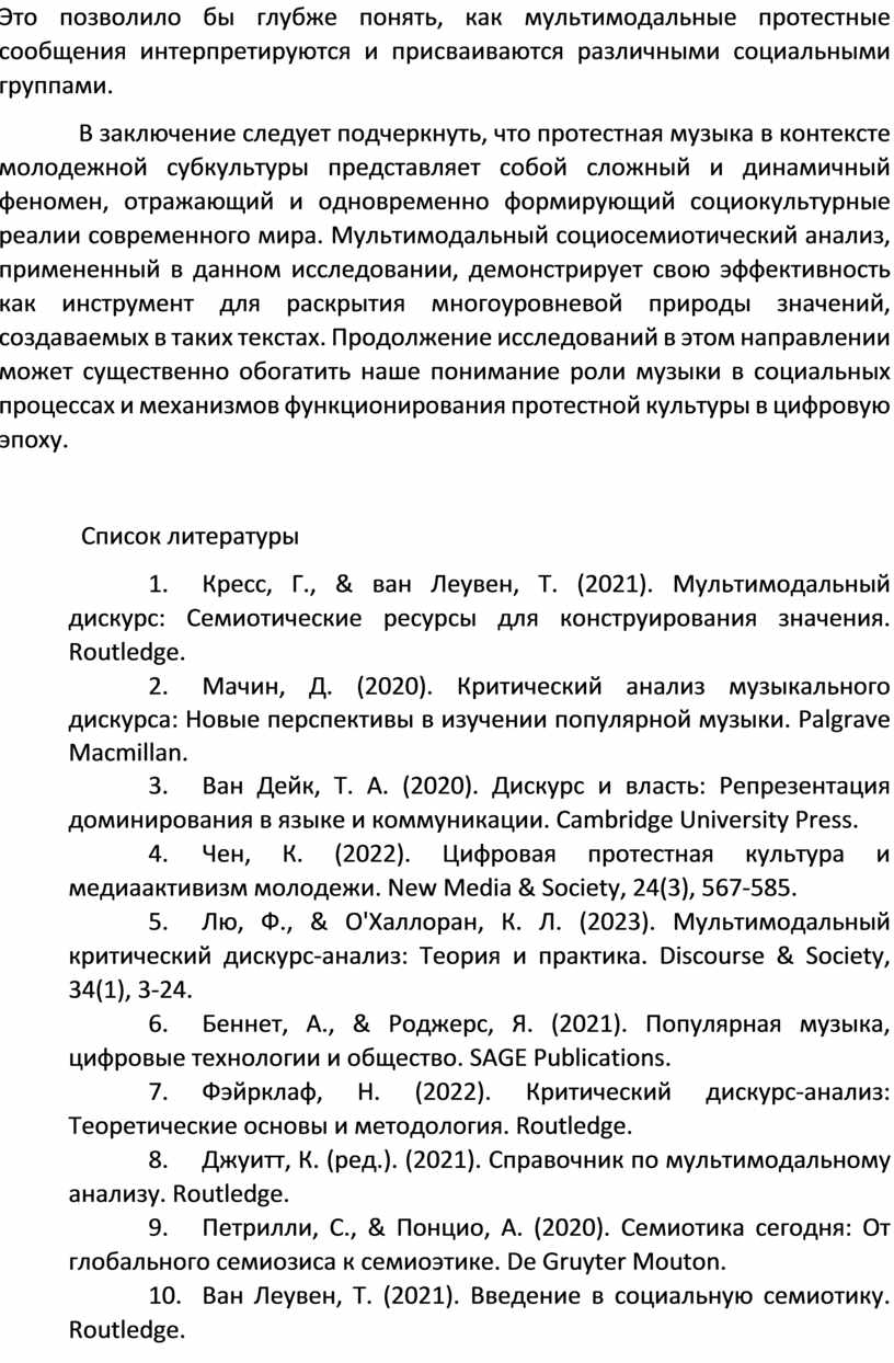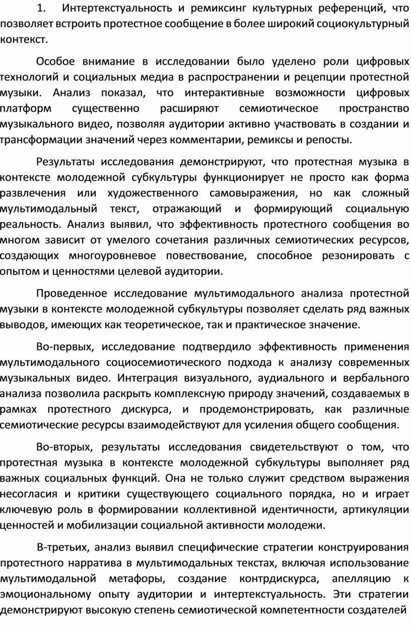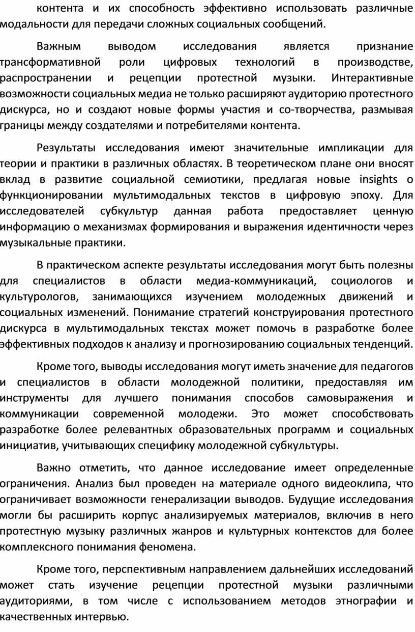 В заключение следует подчеркнуть, что протестная музыка в контексте молодежной субкультуры представляет собой сложный и динамичный феномен, отражающий и одновременно формирующий социокультурные реалии современного мира. Мультимодальный социосемиотический анализ, примененный в данном исследовании, демонстрирует свою эффективность как инструмент для раскрытия многоуровневой природы значений, создаваемых в таких текстах. Продолжение исследований в этом направлении может существенно обогатить наше понимание роли музыки в социальных процессах и механизмов функционирования протестной культуры в цифровую эпоху.