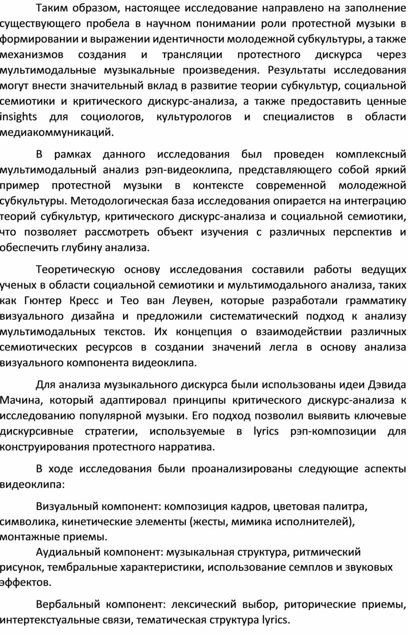 Таким образом, настоящее исследование направлено на заполнение существующего пробела в научном понимании роли протестной музыки в формировании и выражении идентичности молодежной субкультуры, а также механизмов создания и трансляции протестного дискурса через мультимодальные музыкальные произведения. Результаты исследования могут внести значительный вклад в развитие теории субкультур, социальной семиотики и критического дискурс-анализа, а также предоставить ценные insights для социологов, культурологов и специалистов в области медиакоммуникаций.