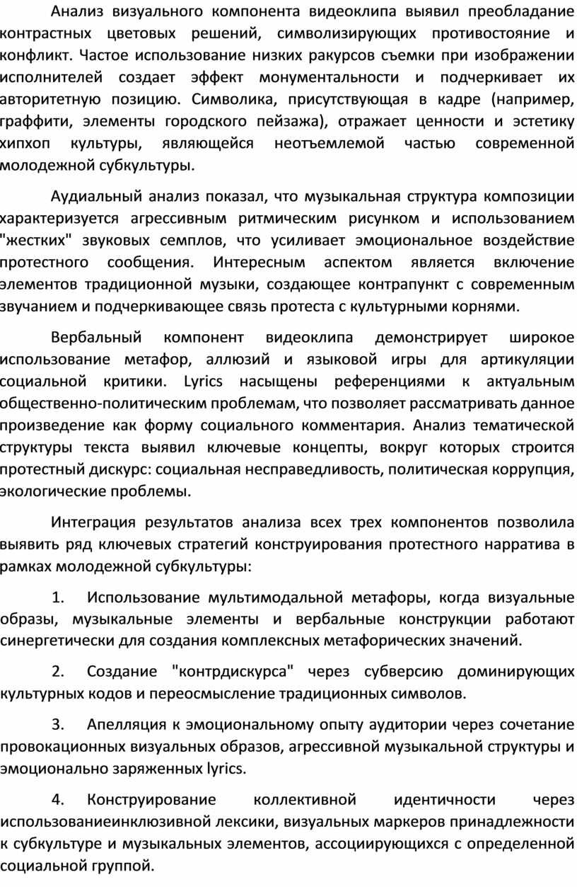 Интеграция результатов анализа всех трех компонентов позволила выявить ряд ключевых стратегий конструирования протестного нарратива в рамках молодежной субкультуры: