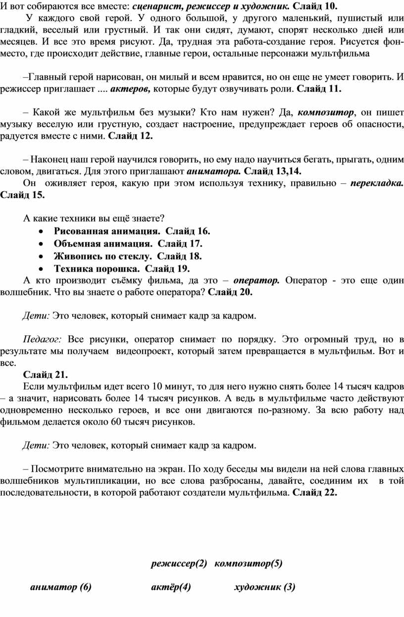 – Посмотрите внимательно на экран. По ходу беседы мы видели на ней слова главных волшебников мультипликации, но все слова разбросаны, давайте, соединим их в той последовательности, в которой работают создатели мультфильма. Слайд 22.