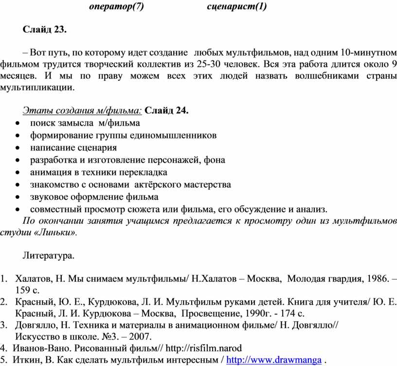 2. Красный, Ю. Е., Курдюкова, Л. И. Мультфильм руками детей. Книга для учителя/ Ю. Е. Красный, Л. И. Курдюкова – Москва, Просвещение, 1990г. - 174 с.