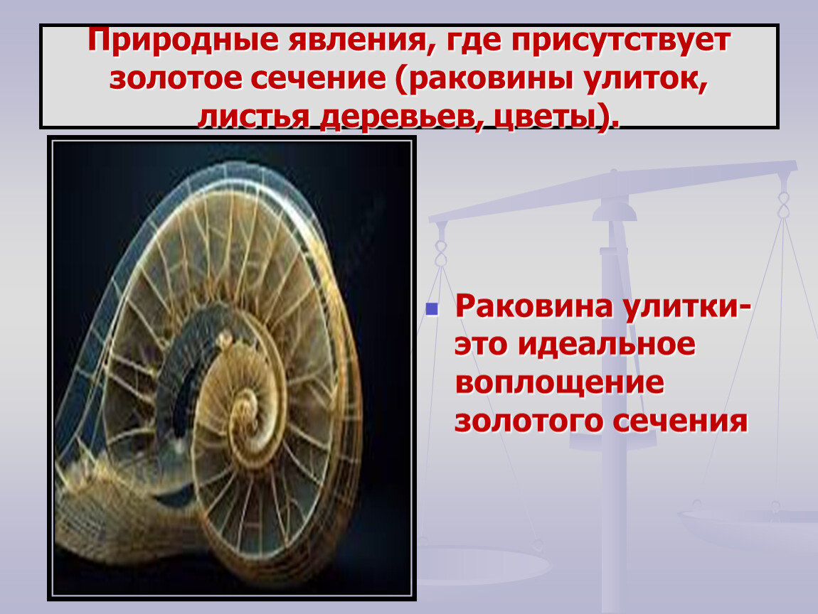 Природные явления, где присутствует золотое сечение (раковины улиток, листья деревьев, цветы).