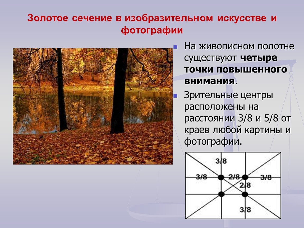 Зрительные центры расположены на расстоянии 3/8 и 5/8 от краев любой картины и фотографии.