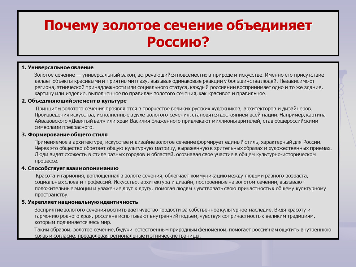Единое культурное пространство. При изучении золотого сечения школьники начинают понимать, что мир прекрасен и упорядочен. Принцип золотого сечения учит видеть скрытые закономерности и воспринимать окружающую действительность как единое целое, сближающее разные регионы и народы России. Таким образом, золотое сечение становится мощным инструментом укрепления общественного согласия, духовного единства и повышения качества жизни в России.