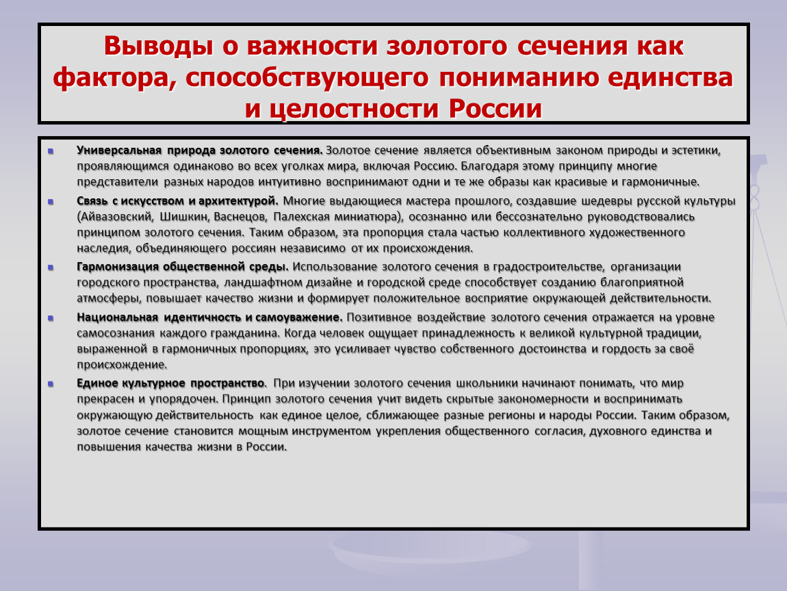 Выводы о важности золотого сечения как фактора, способствующего пониманию единства и целостности России