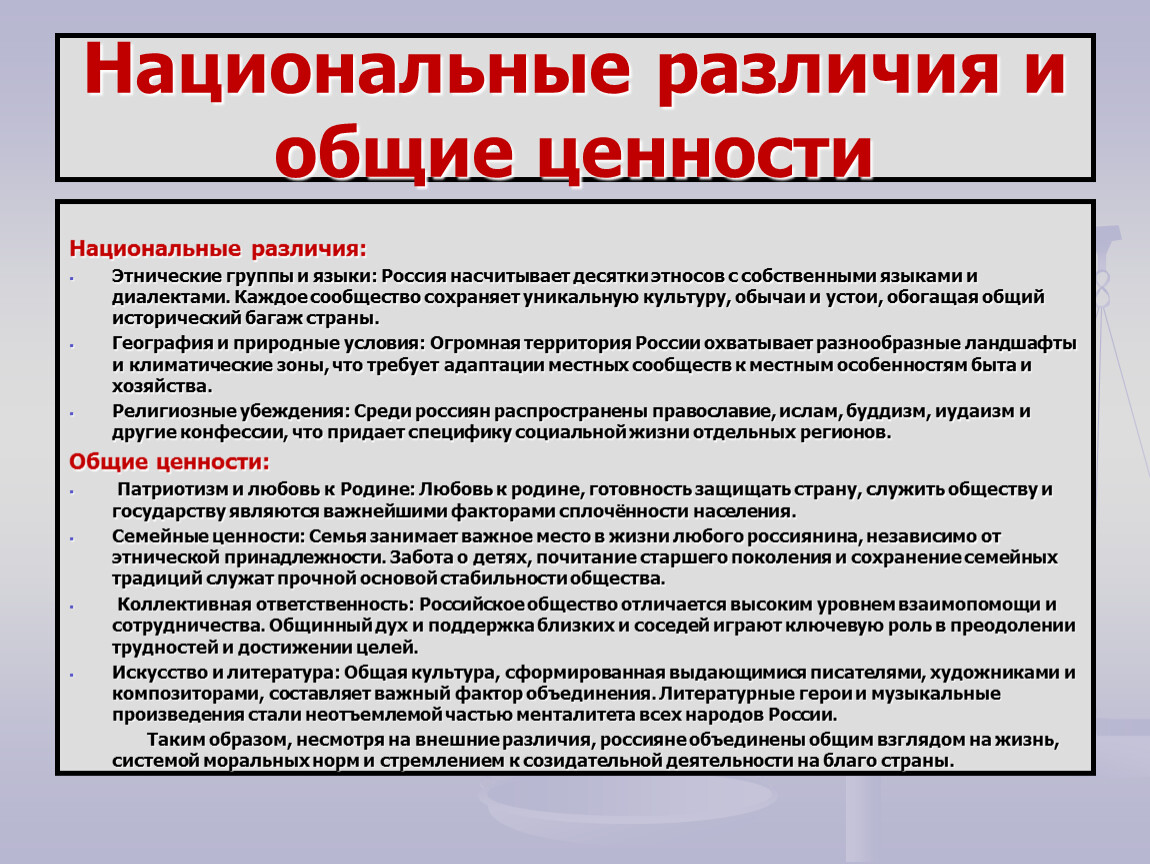 Таким образом, несмотря на внешние различия, россияне объединены общим взглядом на жизнь, системой моральных норм и стремлением к созидательной деятельности на благо страны.