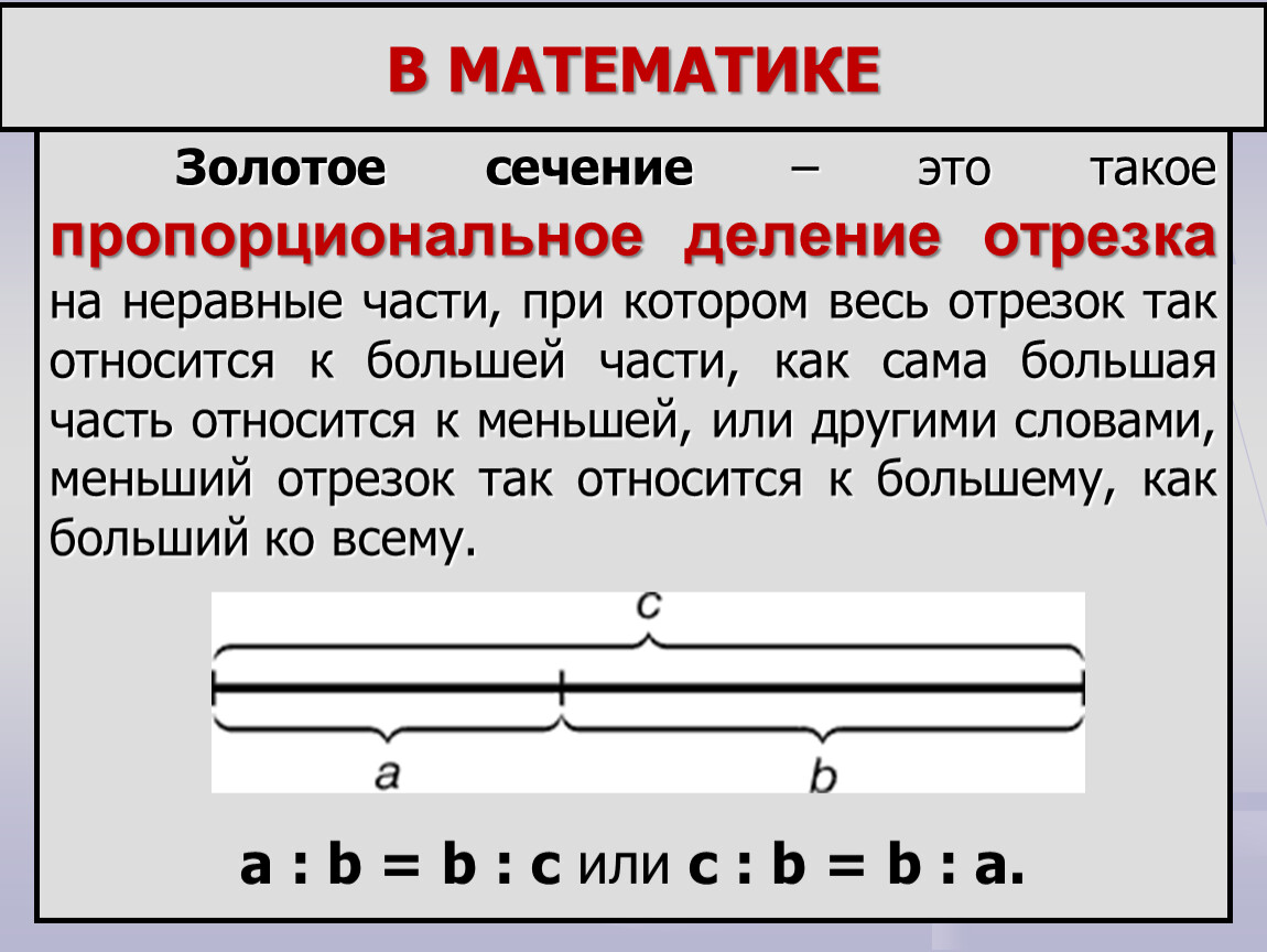 Золотое сечение – это такое пропорциональное деление отрезка на неравные части, при котором весь отрезок так относится к большей части, как сама большая часть относится к меньшей, или другими словами, меньший отрезок так относится к большему, как больший ко всему.