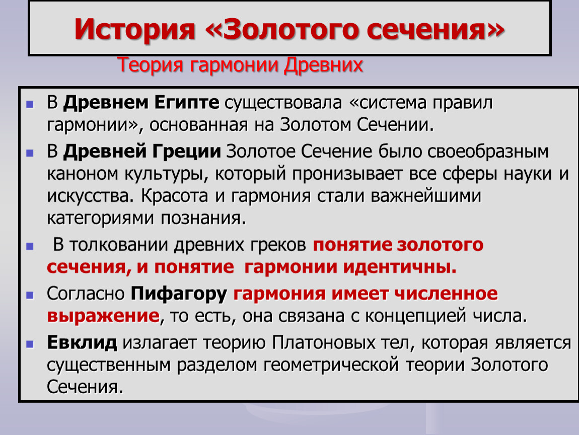 В толковании древних греков понятие золотого сечения, и понятие гармонии идентичны.
