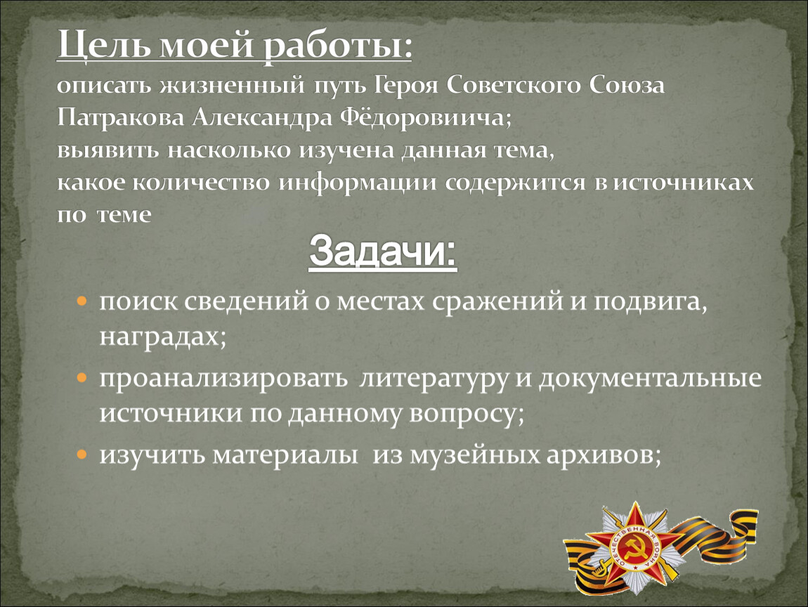 Цель моей работы: описать жизненный путь Героя Советского Союза Патракова Александра Фёдоровиича; выявить насколько изучена данная тема, какое количество информации содержится в источниках по теме