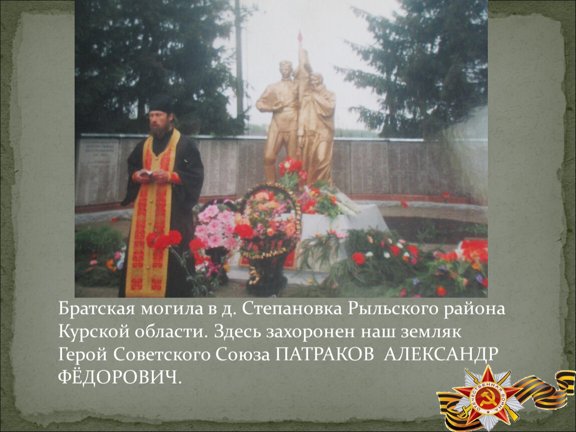 Братская могила в д. Степановка Рыльского района Курской области. Здесь захоронен наш земляк Герой Советского Союза ПАТРАКОВ АЛЕКСАНДР ФЁДОРОВИЧ.