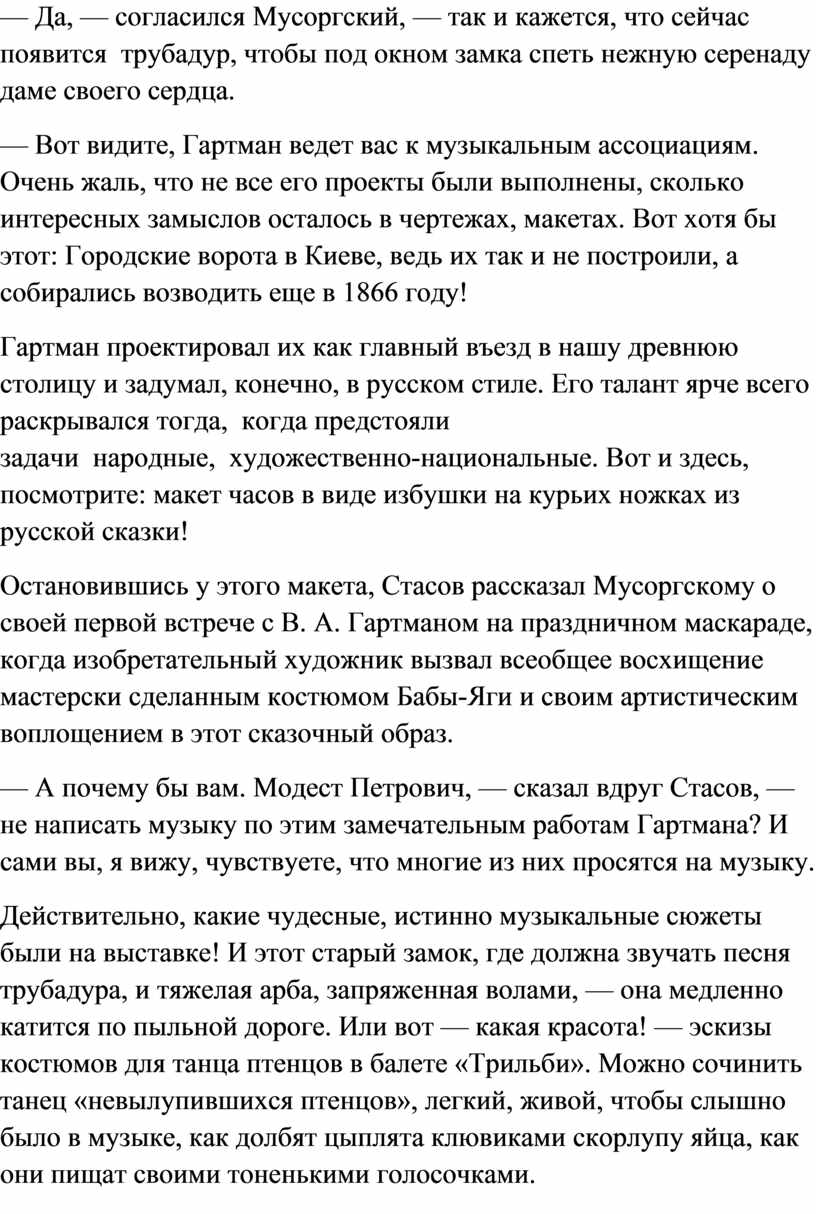 — А почему бы вам. Модест Петрович, — сказал вдруг Стасов, — не написать музыку по этим замечательным работам Гартмана? И сами вы, я вижу, чувствуете, что многие из них просятся на музыку.