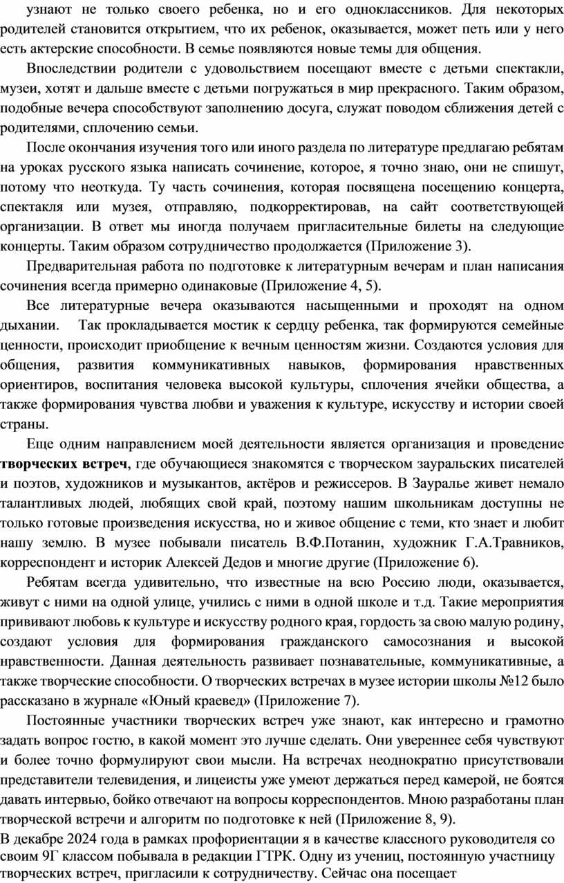 В декабре 2024 года в рамках профориентации я в качестве классного руководителя со своим 9Г классом побывала в редакции ГТРК. Одну из учениц, постоянную участницу творческих встреч, пригласили к сотрудничеству. Сейчас она посещает занятия по постановке речи и дыхания, изучает нейросети, знает, как снимаются и монтируются новости и как работает вся эфирная группа. Опыт внимательно слушать собеседника, адекватно воспринимать информацию, умение задавать вопросы и вести беседу, возможно, повлияли на судьбу девочки, и работа на телевидении станет делом её жизни (Приложение 10).