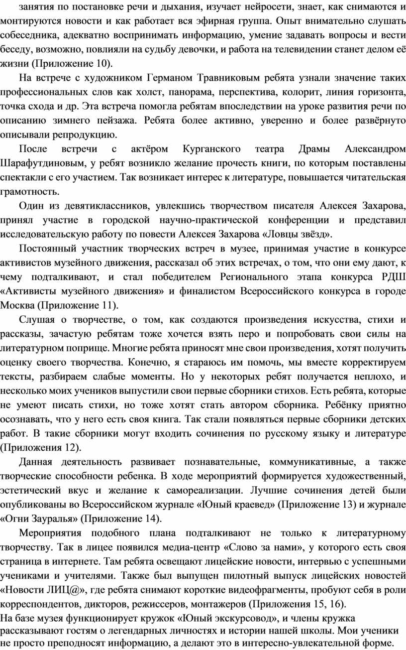 Еще одним направлением моей деятельности является организация и проведение творческих встреч, где обучающиеся знакомятся с творческом зауральских писателей и поэтов, художников и музыкантов, актёров и режиссеров. В Зауралье живет немало талантливых людей, любящих свой край, поэтому нашим школьникам доступны не только готовые произведения искусства, но и живое общение с теми, кто знает и любит нашу землю. В музее побывали писатель В.Ф.Потанин, художник Г.А.Травников, корреспондент и историк Алексей Дедов и многие другие (Приложение 6).