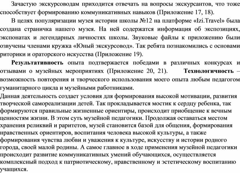 В целях популяризации музея истории школы №12 на платформе «Izi.Travel» была создана страничка нашего музея. На ней содержатся информация об экспозициях, экспонатах и легендарных личностях школы. Звуковые файлы к приложению были озвучены членами кружка «Юный экскурсовод». Так ребята познакомились с основами риторики и ораторского искусства (Приложение 19).