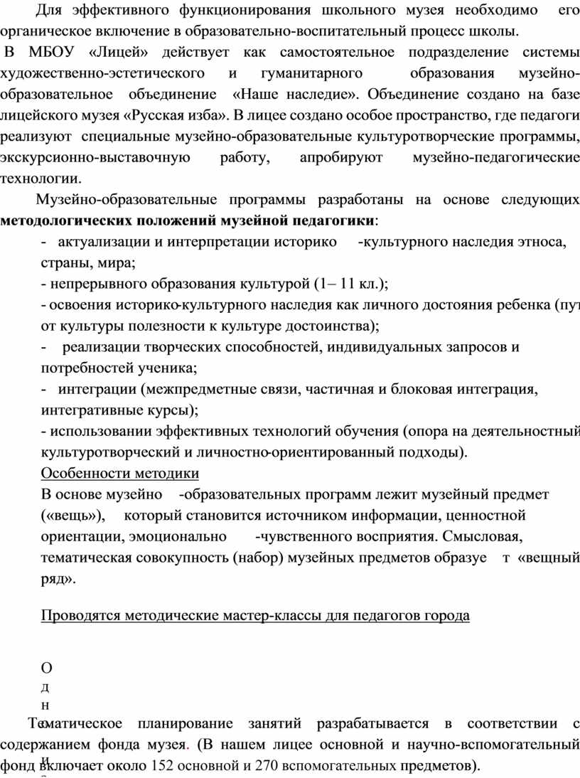 Тематическое планирование занятий разрабатывается в соответствии с содержанием фонда музея. (В нашем лицее основной и научно-вспомогательный фонд включает около 152 основной и 270 вспомогательных предметов).