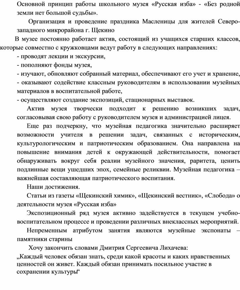 Музейной педагогикой я занимаюсь несколько лет. Всё началось с создания школьного музея «Русская изба» и организации работы ученического объединения дополнительного образования «Наше наследие», а сейчас это стало неотъемлемой частью духовно-патриотического воспитания учащихся в школе.