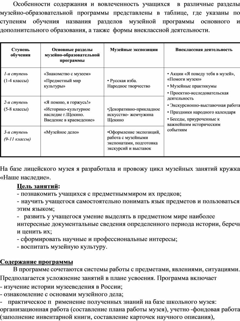 Особенности содержания и вовлеченность учащихся в различные разделы музейно-образовательной программы представлены в таблице, где указаны по ступеням обучения названия разделов музейной программы основного и дополнительного образования, а также формы внеклассной деятельности.