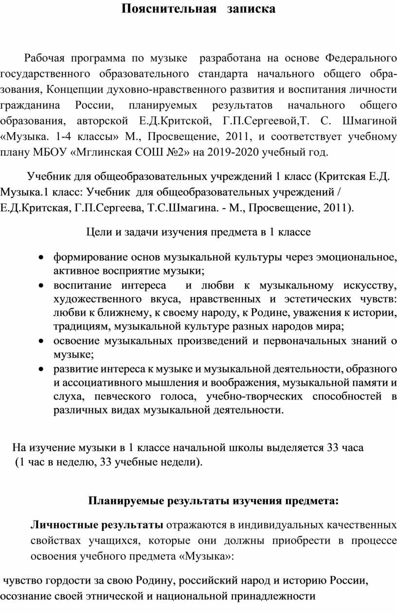 Рабочая программа по музыке разработана на основе Федерального государственного образовательного стандарта начального общего образования, Концепции духовно-нравственного развития и воспитания личности гражданина России, планируемых результатов начального общего образования, авторской Е.Д.Критской, Г.П.Сергеевой,Т. С. Шмагиной «Музыка. 1-4 классы» М., Просвещение, 2011, и соответствует учебному плану МБОУ «Мглинская СОШ №2» на 2019-2020 учебный год.
