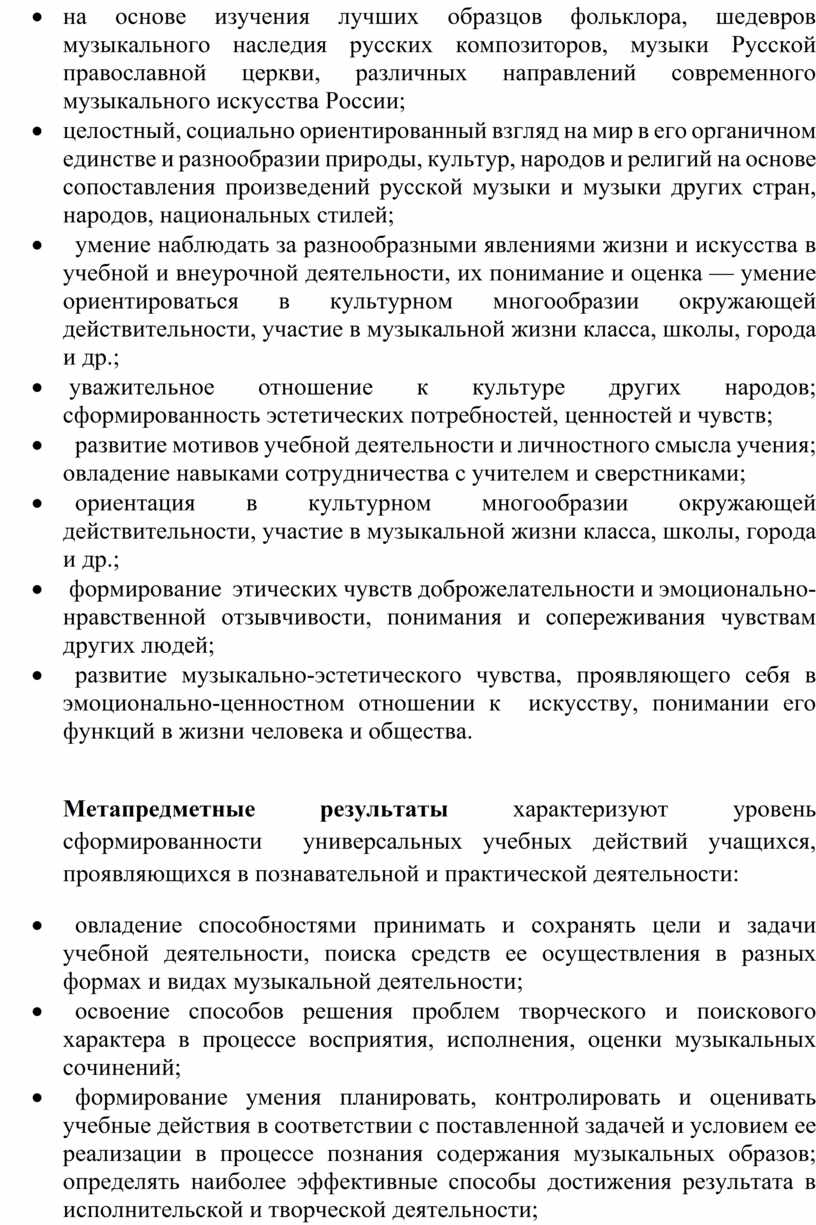 · чувство гордости за свою Родину, российский народ и историю России, осознание своей этнической и национальной принадлежности на основе изучения лучших образцов фольклора, шедевров музыкального наследия русских композиторов, музыки Русской православной церкви, различных направлений современного музыкального искусства России;