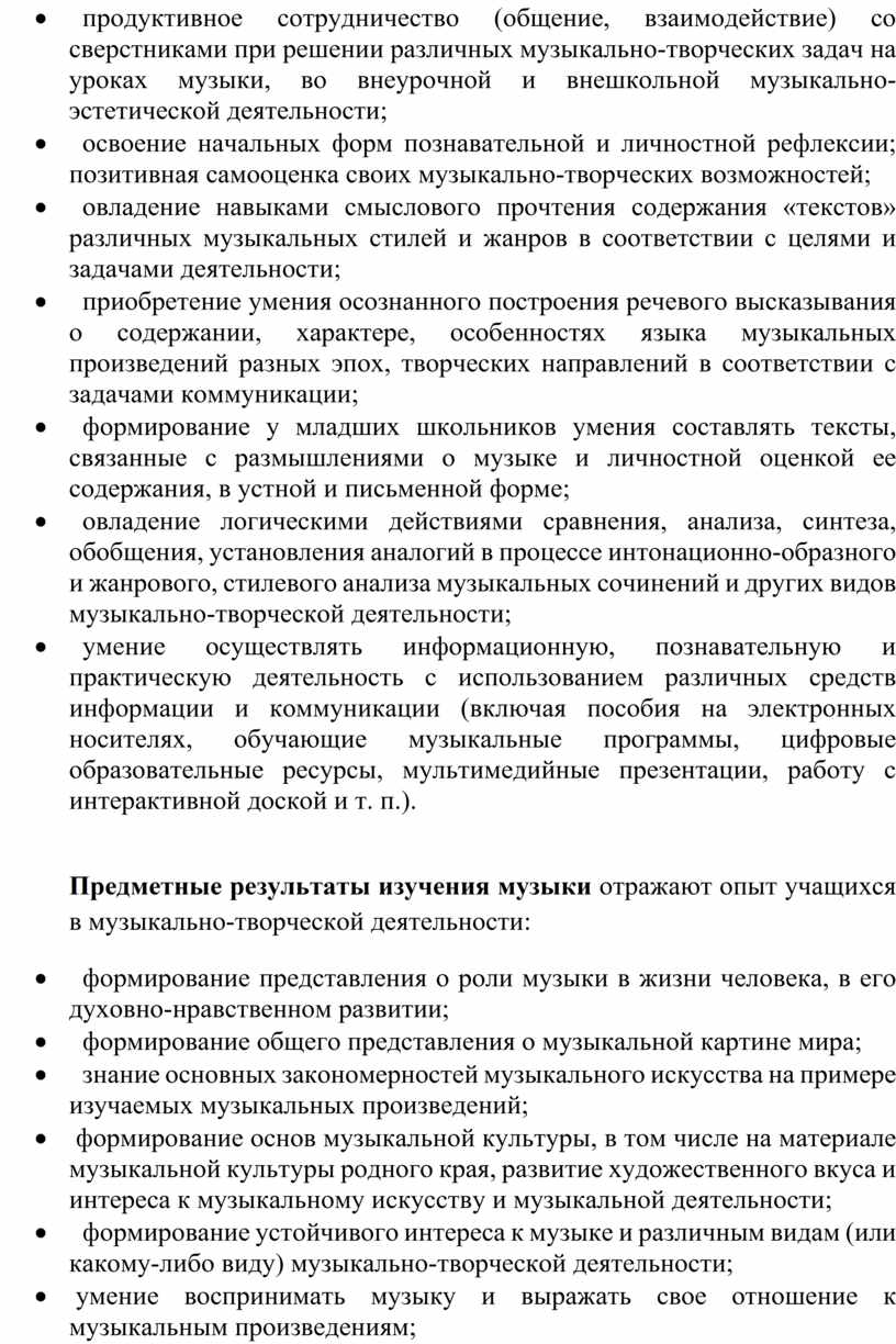 Предметные результаты изучения музыки отражают опыт учащихся в музыкально-творческой деятельности: