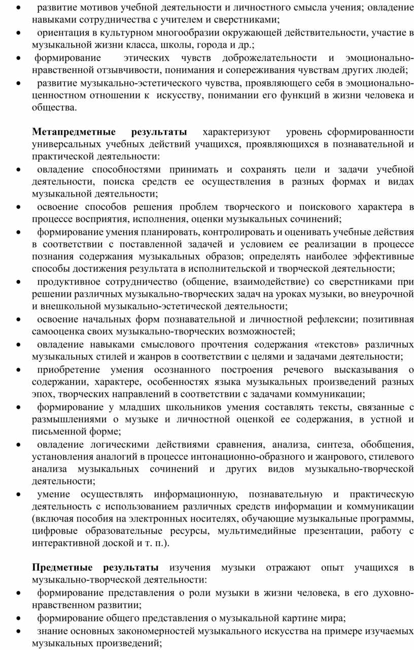 Предметные результаты изучения музыки отражают опыт учащихся в музыкально-творческой деятельности: