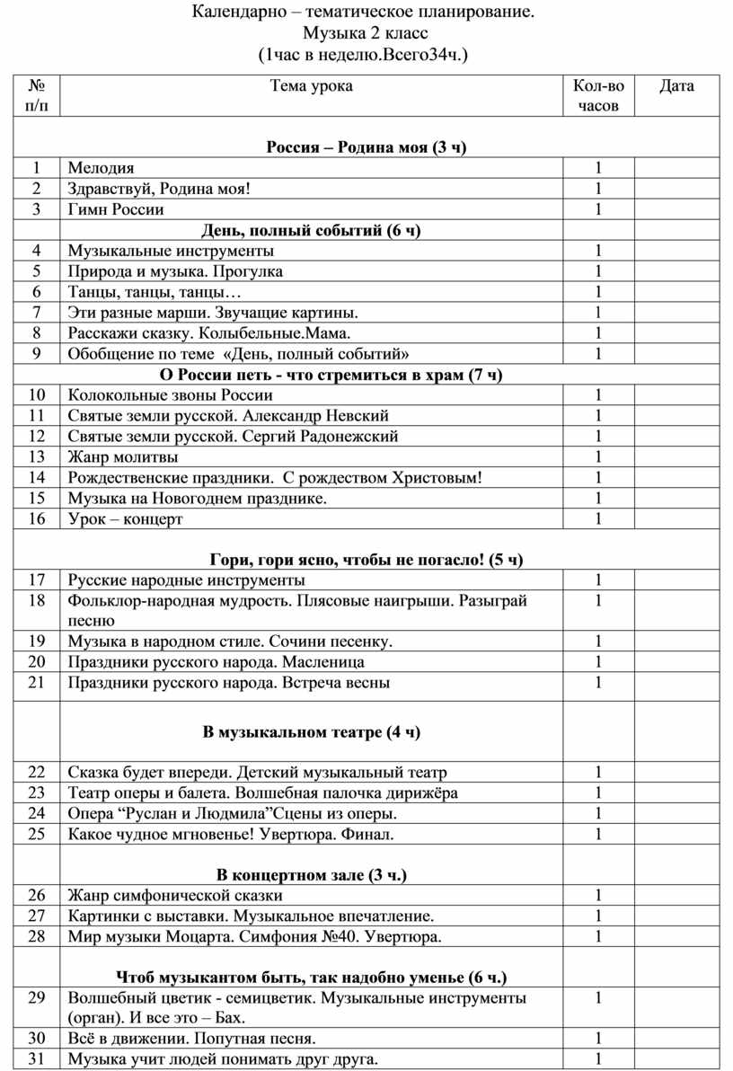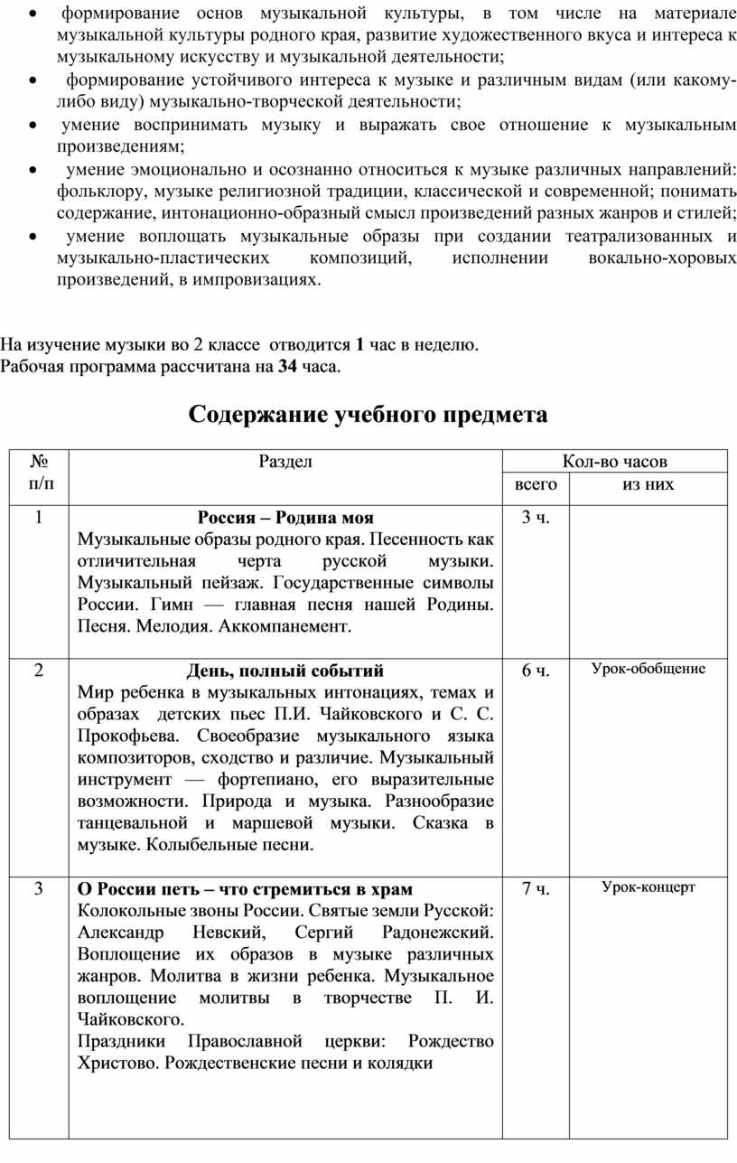 На изучение музыки во 2 классе отводится 1 час в неделю.