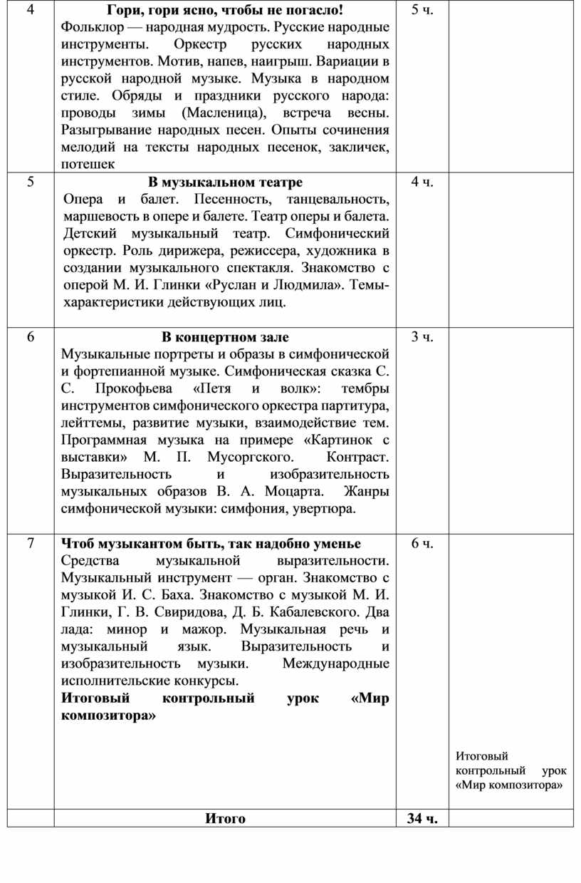 Гори, гори ясно, чтобы не погасло! Фольклор — народная мудрость. Русские народные инструменты. Оркестр русских народных инструментов. Мотив, напев, наигрыш. Вариации в русской народной музыке. Музыка в народном стиле. Обряды и праздники русского народа: проводы зимы (Масленица), встреча весны. Разыгрывание народных песен. Опыты сочинения мелодий на тексты народных песенок, закличек, потешек |